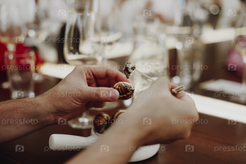 Мужчина ест улитки специальной вилкой, наслаждаясь ужином в ресторане во время отпуска