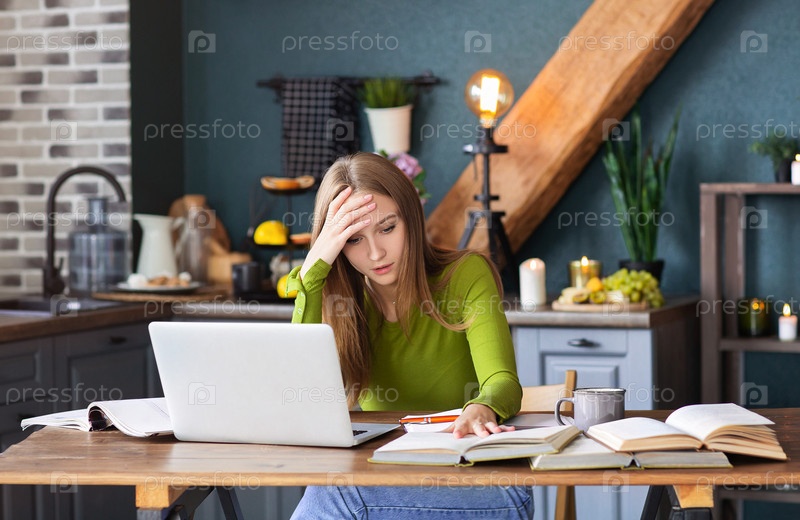 Молодая задумчивая женщина-фрилансер сидит дома за столом с ноутбуком и делает заметки