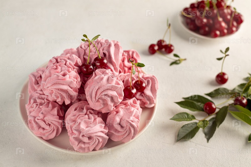 Вкусный сладкий зефир и вишня на светлом фоне, концепция здорового и здорового домашнего производства