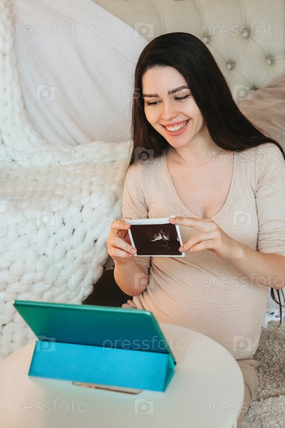 Молодая счастливая беременная женщина с УЗИ ребенка в руке разговаривает онлайн на цифровом планшете, разговаривает по видеосвязи с семьей