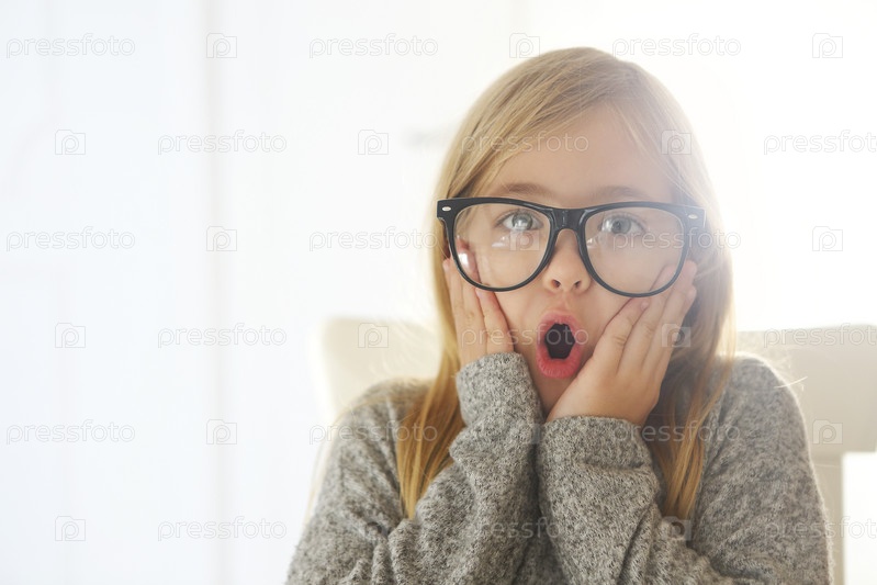 Улыбающаяся милая девочка в черных очках на белом фоне