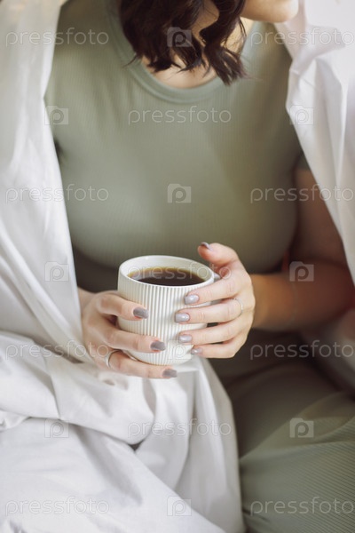 Расслабленная позитивная молодая брюнетка в домашней одежде сидит на неубранной кровати с чашкой чая в руках, медленно пьет ароматный горячий напиток, наслаждаясь проведением свободного времени в одиночестве дома. Крупным планом