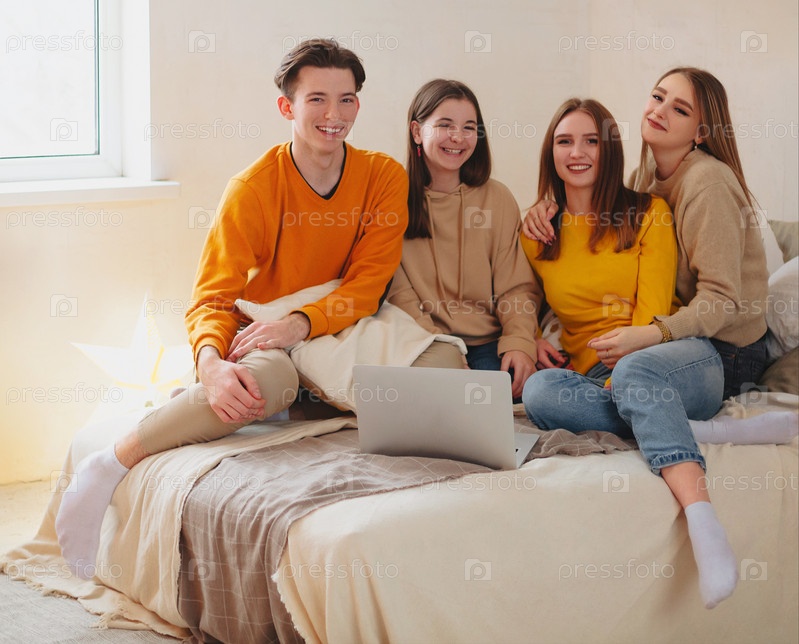Друзья-подростки смотрят забавный контент на ноутбуке и смеются