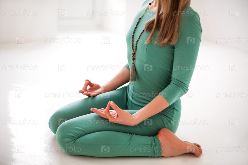 Женщина в спортивной одежде сидит со скрещенными ногами и руками мудры, занимается йогой, практикуя осознанность