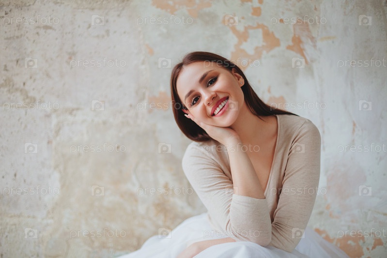 Красивая молодая брюнетка романтичная женщина сидит босиком в пушистой длинной белой юбке у бетонной стены в винтажном стиле