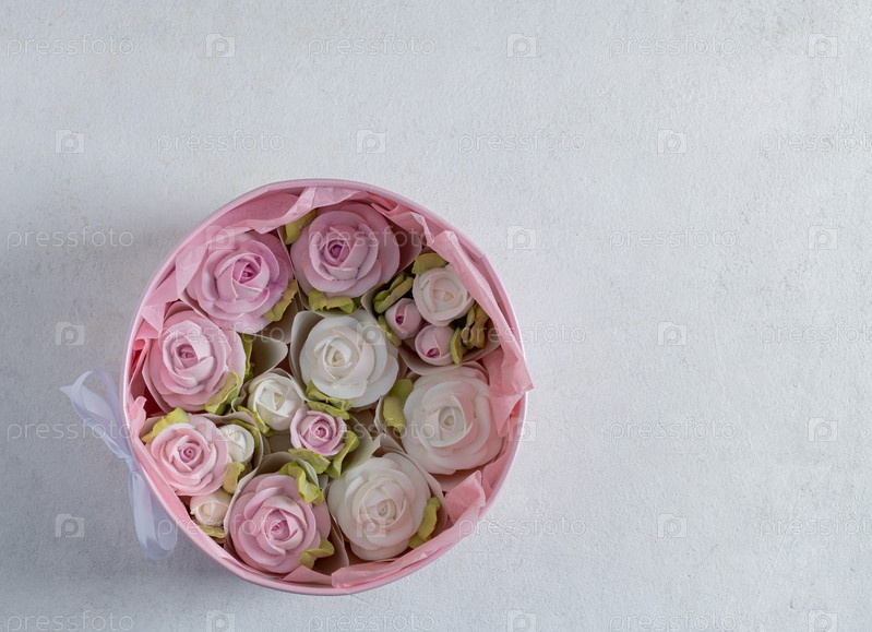 Зефирный букет цветов в подарочной коробке на светлом фоне, вид сверху, праздничная концепция, День святого Валентина