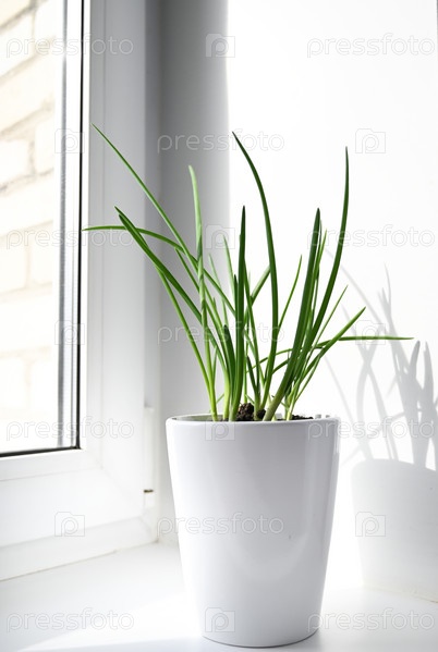 Огород молодого лука на подоконнике. Выращивание лука на подоконнике. Свежий зеленый лук дома Садоводство в помещении выращивает зеленый лук в цветочном горшке на подоконнике. Свежие ростки зеленого лука