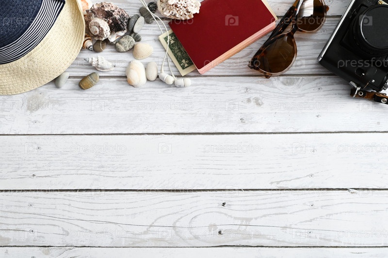 Туристическая одежда, шляпа, шлепанцы, солнцезащитные очки и декоративные предметы на светлом пастельном фоне. Плоская планировка, вид сверху. ВСЕМИРНЫЙ ДЕНЬ ТУРИЗМА