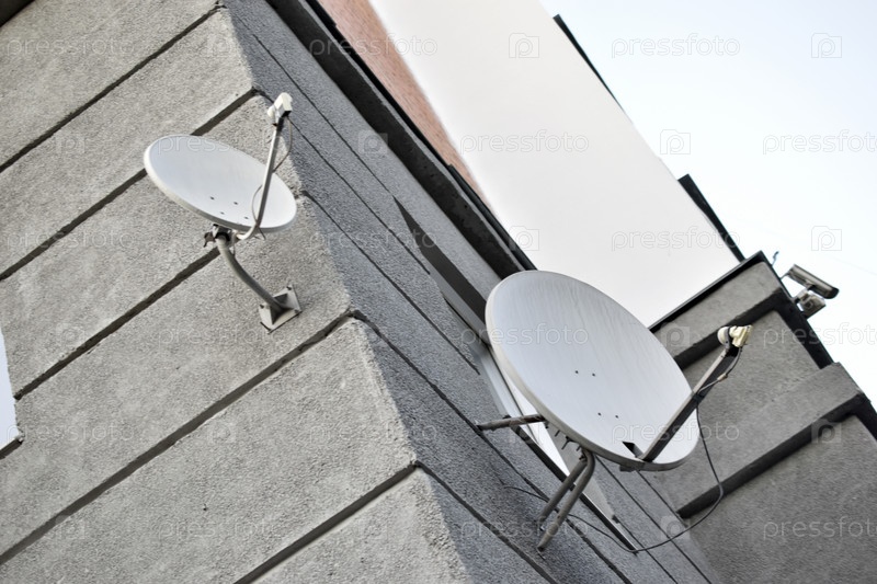 Спутниковая тарелка на сером крупном плане здания. Параболическая антенна на стене