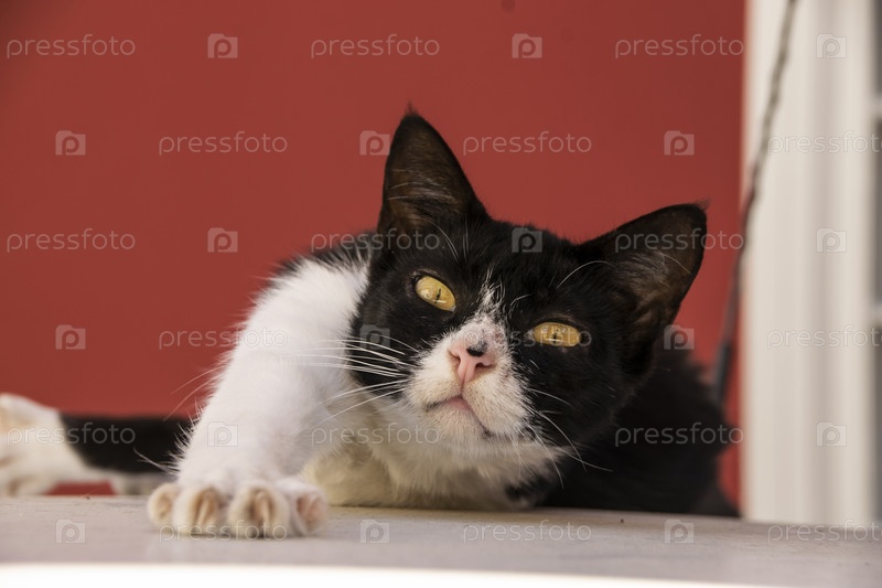 Черно-белый бездомный кот растянулся на крыше автомобиля
