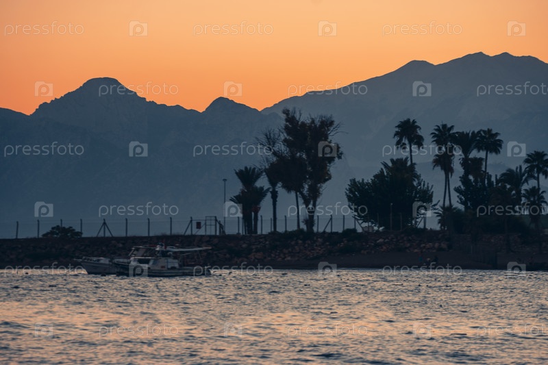 Яркий, красивый закат на море с видом на горы