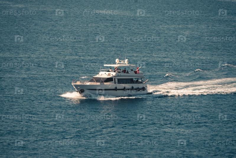 Небольшой прогулочный катер движется по поверхности моря в солнечный день