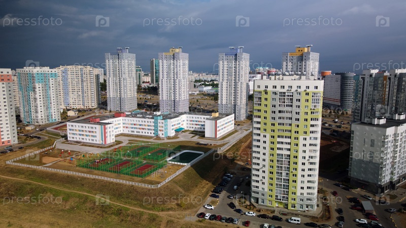Современная городская архитектура. Многоэтажные дома с инфраструктурой. Густонаселенная городская территория. Пасмурная погода. Аэрофотосъемка