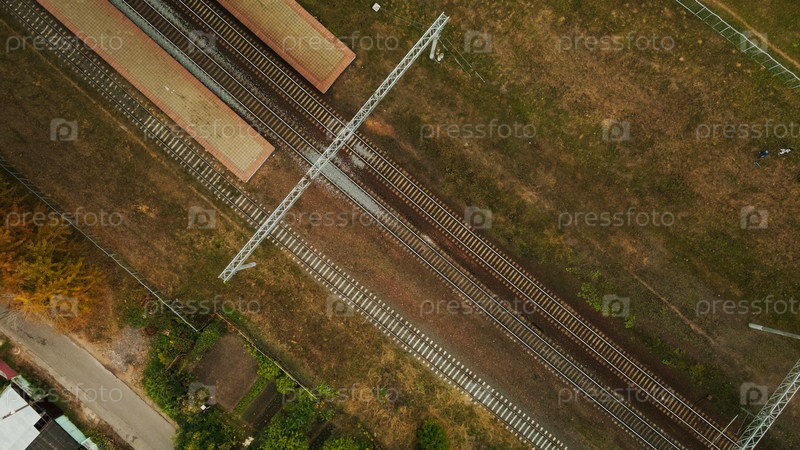 Железнодорожная станция. Платформа и железнодорожные пути. Аэрофотосъемка