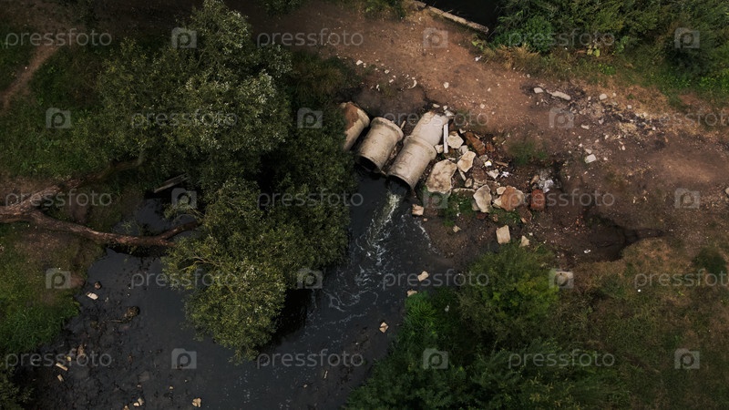 Бетонные трубы для канализации. Грязная городская река. С заросшими берегами. Аэрофотосъемка