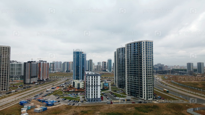 Строительная площадка нового городского квартала. Строительство многоэтажных домов. Пасмурная погода. Аэрофотосъемка