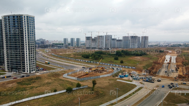 Строительная площадка нового городского квартала. Строительство многоэтажных домов. Пасмурная погода. Аэрофотосъемка