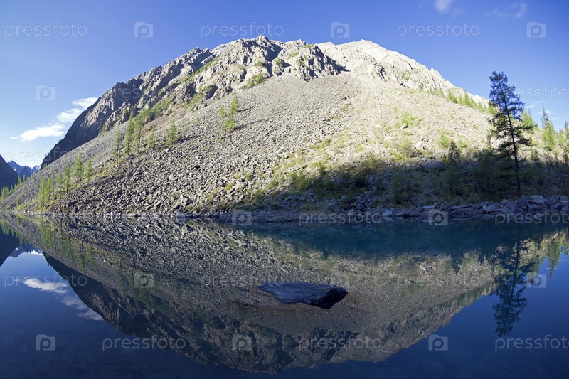 Отражение берега озера в водной глади. Раннее солнечное утро. Большое (нижнее) Шавлинское озеро. Горный Алтай. Август