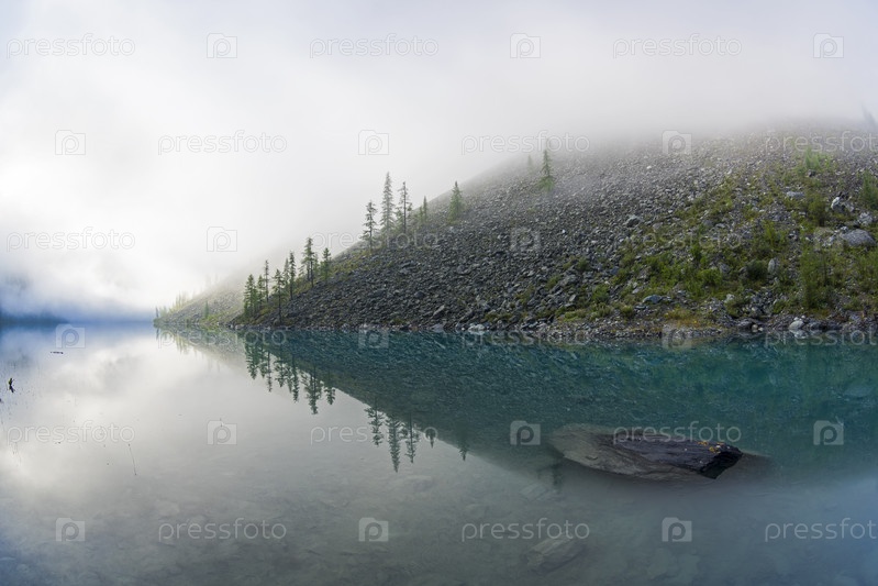 Отражение берега озера в водной глади. Туманное летнее утро. Большое (нижнее) Шавлинское озеро. Горный Алтай. Август