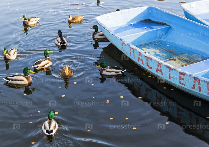 Утки у лодочной станции. Пруд в Теплостановском лесопарке. Москва, Россия. Солнечный день в октябре