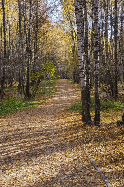 Пешеходная дорожка в ландшафтном заказнике Теплый Стан. Солнечный день в октябре