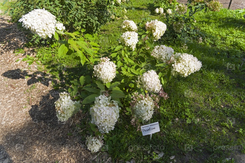 Цветущая гортензия метельчатая сорта Фантом в Аптекарском Огороде (филиал ботанического сада МГУ). Москва. Солнечный день в начале сентября