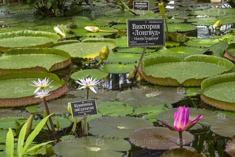 Тропические водные растения (кувшинки и виктория амазонская) в оранжерее Аптекарского огорода (филиал ботанического сада МГУ, Москва)
