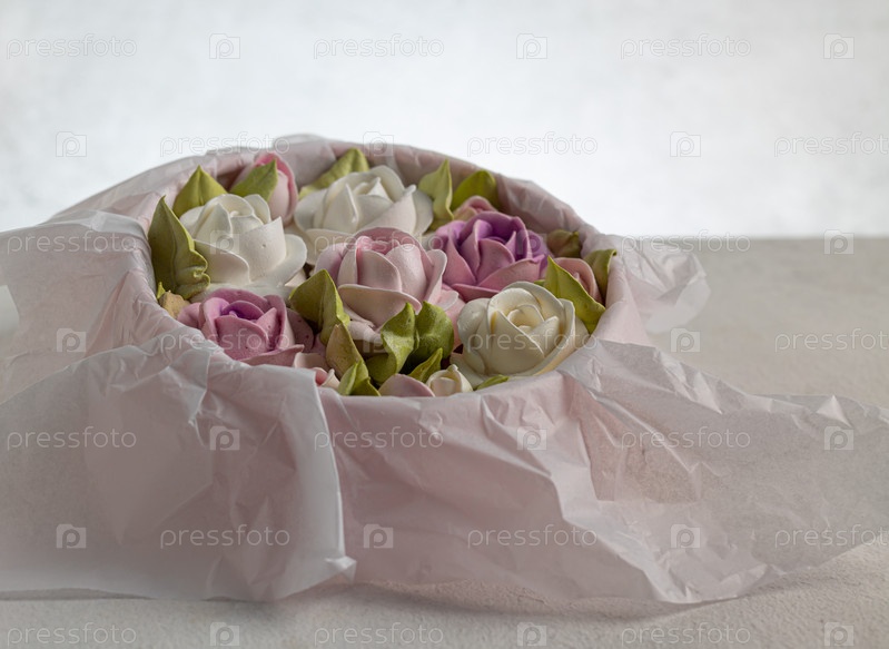Зефирный букет цветов в подарочной коробке на светлом фоне, праздничная концепция, День святого Валентина
