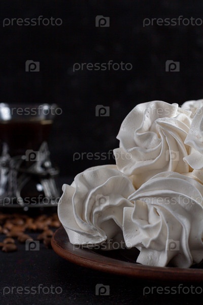 Яблочный зепфир на темном фоне в тарелке, на заднем плане - чашка кофе. Концепция питья кофе