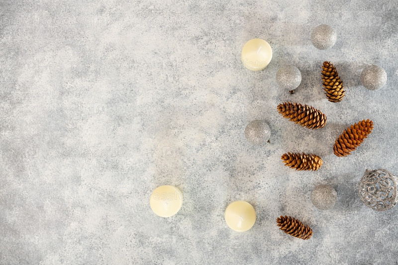Рождественские снежинки, шары со свечами, с шишками на светлом фоне. Выборочный фокус. Место для копирования. вид сверху. Рождество, новогодняя открытка