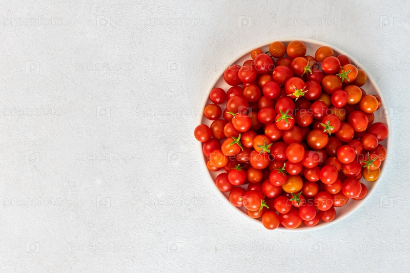 Красные помидоры черри в светлом блюде на светлом фоне, вегетарианский продукт, здоровая пища. копировать пространство