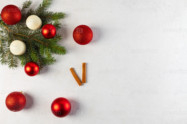 Красные елочные шары со свечами на светлом фоне. Выборочный фокус. Место для копирования. вид сверху