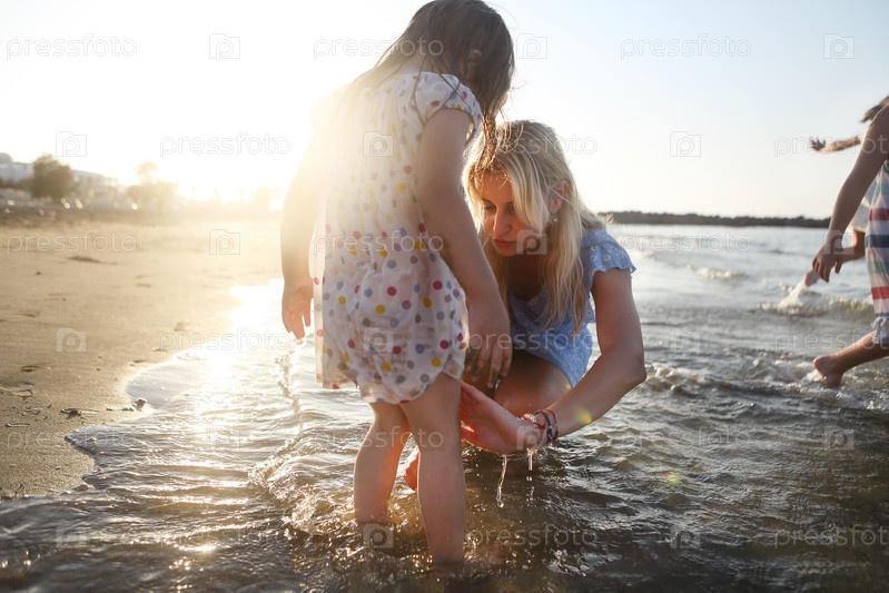 Маленькая девочка с матерью на морском пляже