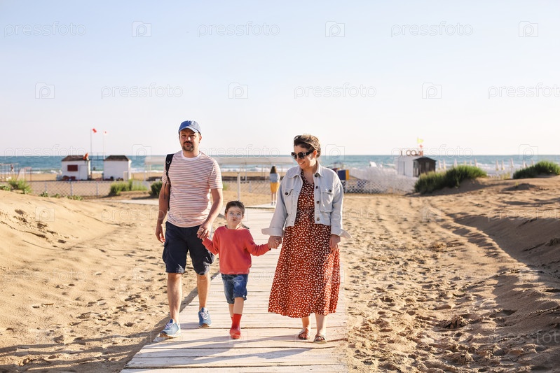 Счастливая семья, мать-отец и маленькая дочь, идущие к летнему морскому пляжу по деревянной дорожке