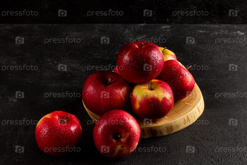 Свежие спелые красные яблоки на темном фоне, вид сбоку