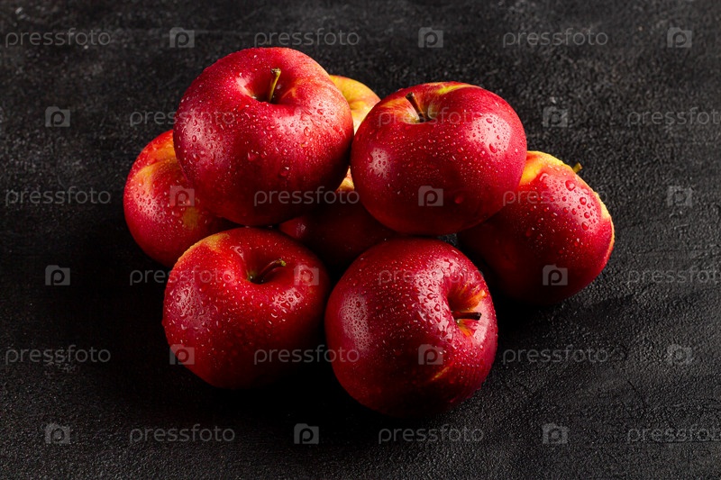Свежие спелые красные яблоки на темном фоне, вид сбоку