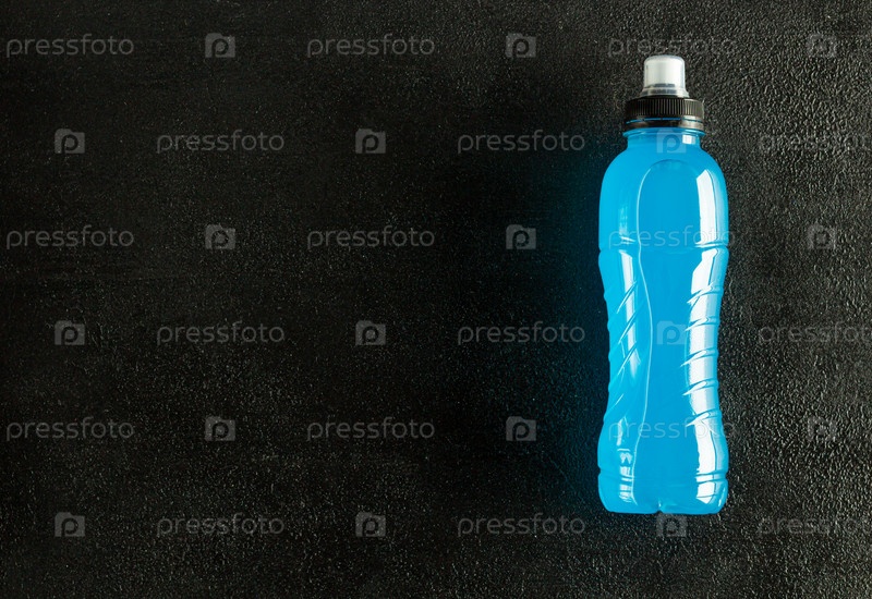 Бутылка изотонического энергетического напитка на темном фоне, освежающий напиток