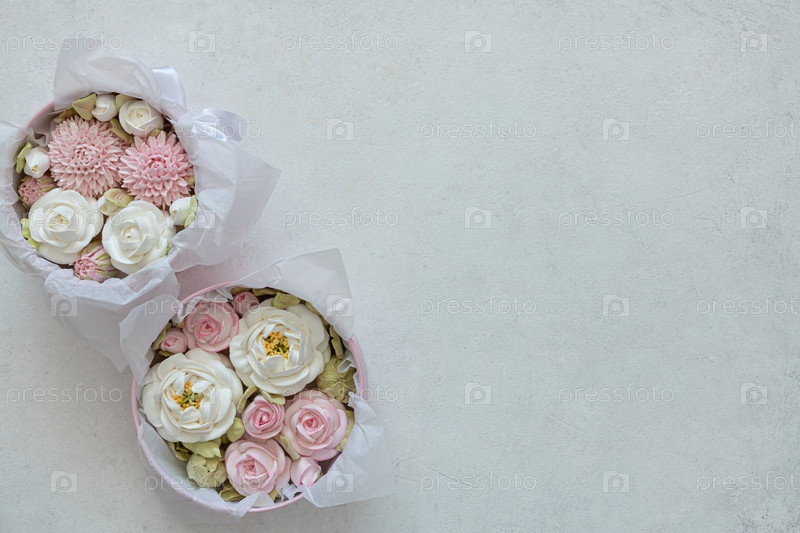 Зефирный букет цветов в розовой коробке на светлом фоне, вид сверху
