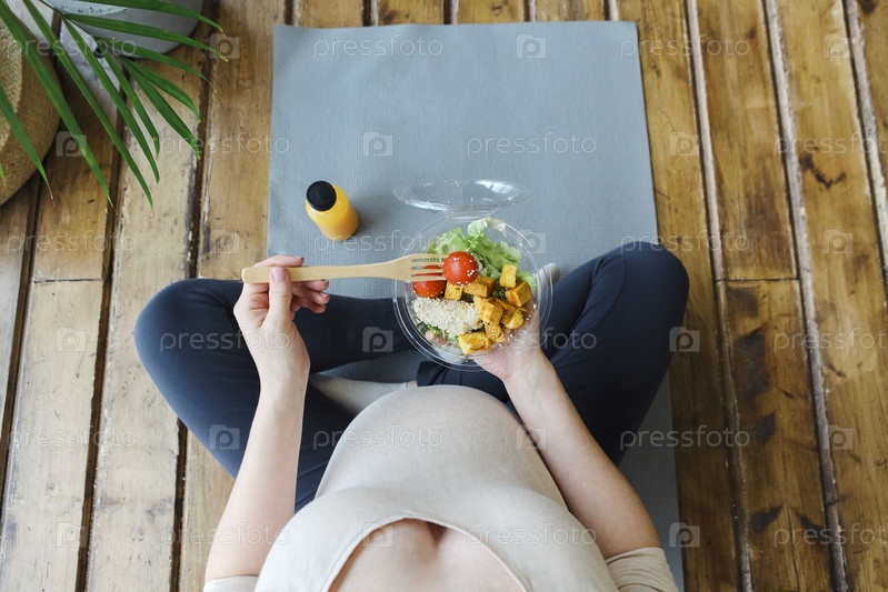 Здоровый образ жизни и питание во время беременности. Молодая счастливая красивая беременная женщина ест салат