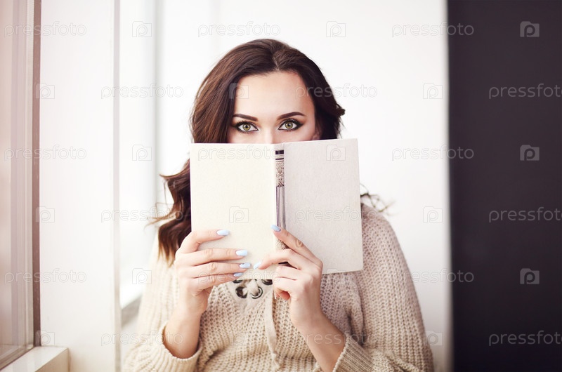 Молодая красивая брюнетка в вязаном свитере читает книгу, отдыхая у окна