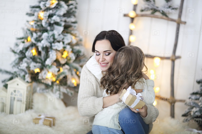 Красивая счастливая мать с младшей дочерью в вязаном свитере сидит на фоне рождественского интерьера