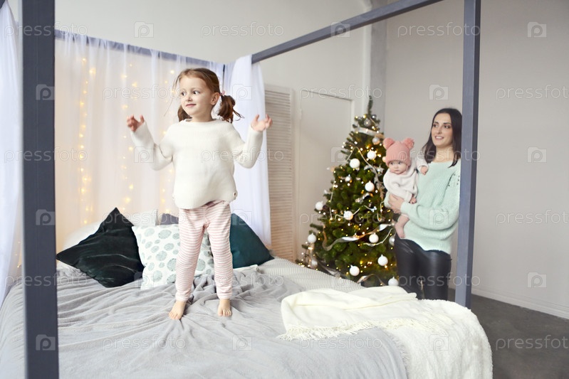 Красивая счастливая мать с младшей дочерью в вязаном свитере сидит на фоне рождественского интерьера