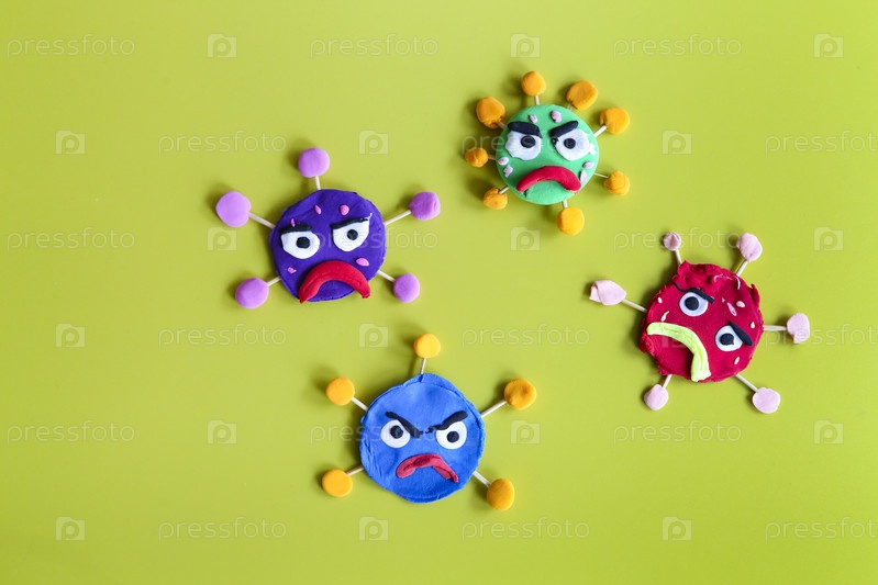 Глиняные персонажи на желтом фоне. Вирус короны или ковид-19