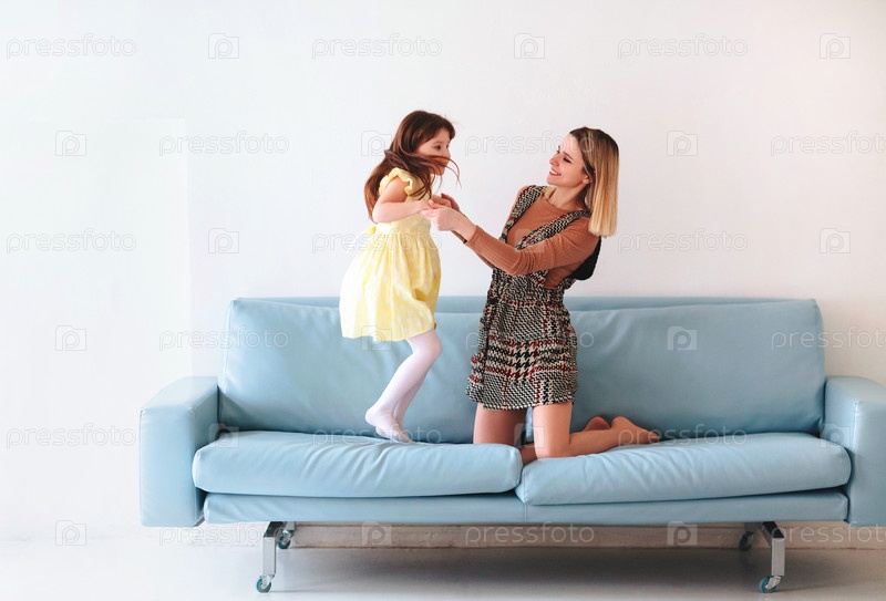 Игривая дочка маленькой девочки играет с позитивной мамой, прыгает на диване