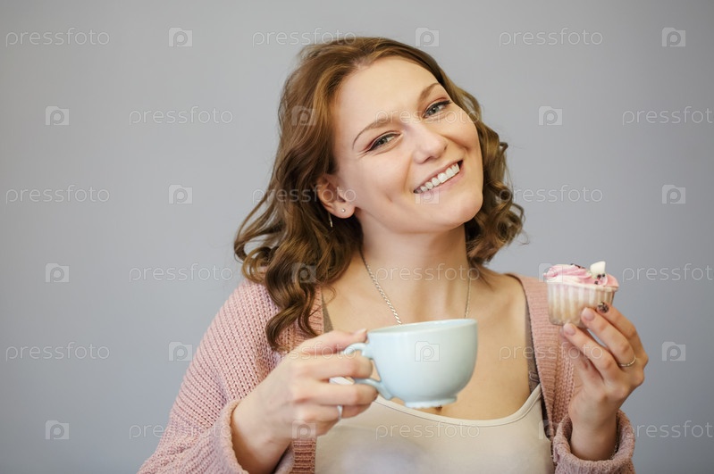 Счастливая молодая женщина ест вкусный розовый кекс с зубастой улыбкой и закрытыми глазами после укуса и дегустации, держа чашку горячего напитка