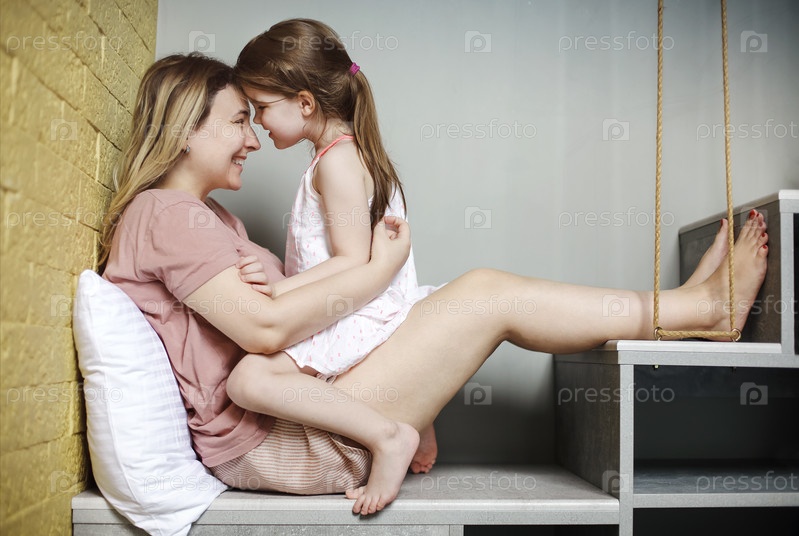 Молодая любящая мать обнимается со своей милой маленькой дочерью, сидя вместе на лестнице дома