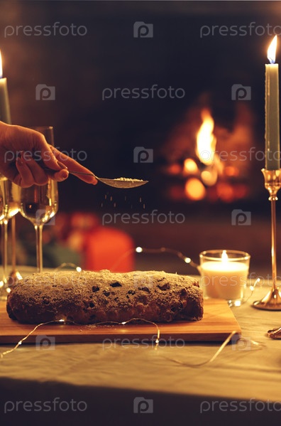 Рождественский ужин. Женская рука посыпает сахарной пудрой на рождественский пирог, стоящий на деревенском деревянном столе с бокалами шампанского и горящими свечами