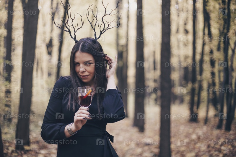 Загадочная женщина в готической повязке с рогами оленя с глинтвейном, стоящая в осеннем лесу