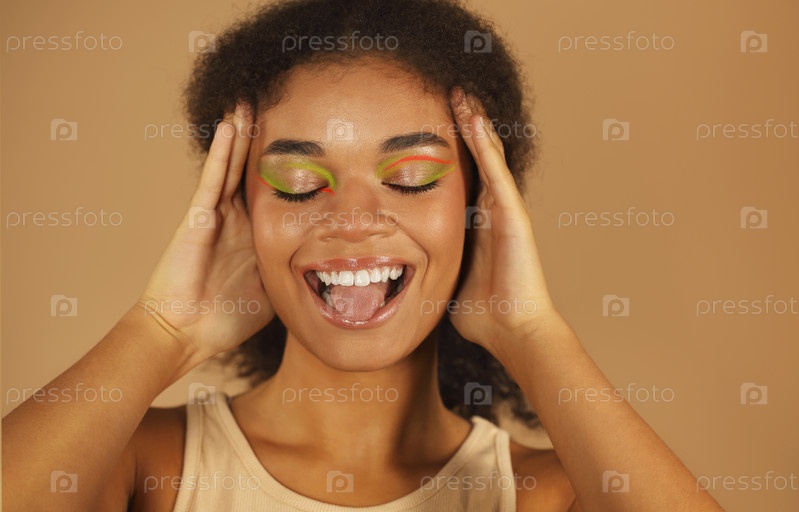 Портрет красоты привлекательной молодой африканской американки с неоновым макияжем, улыбающейся в камеру