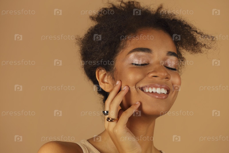Профиль улыбающейся афроамериканки, демонстрирующей кольца на пальцах, держащей руки у лица